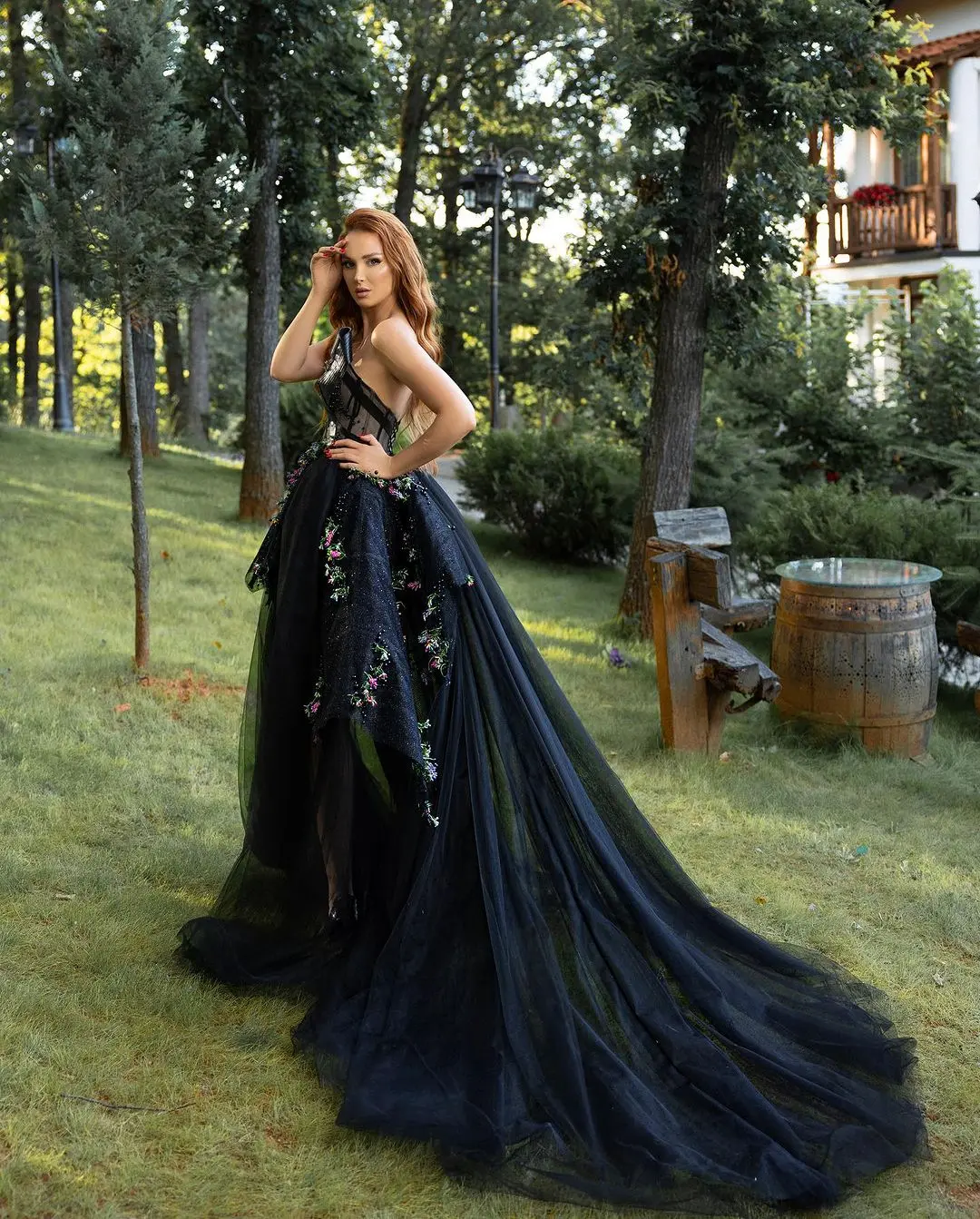 Captivating black dress, leather corset, soft floral details, and tulle skirt expanding to the hem with a left leg slit.